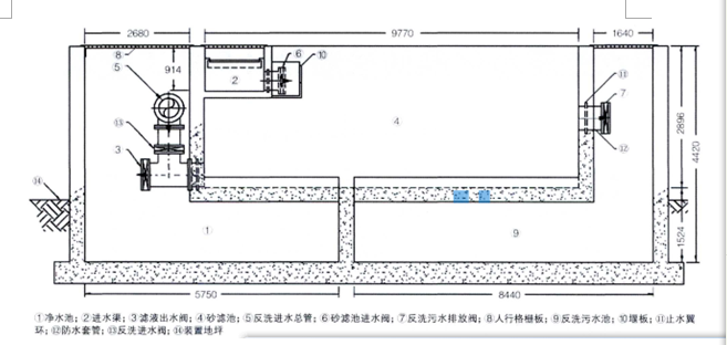 水質(zhì)凈化池池體結(jié)構(gòu)包括進(jìn)水渠、4座凈化砂濾池、濾后凈水池、反洗污水池,池體凈尺寸20840mn1×14690mmx4420mm(長×寬*高),容積135 3m'3,池壁厚度300mm-500mn,。4座砂濾池交替進(jìn)行過濾、反洗和化學(xué)清洗。回川水凈化處理后.m水進(jìn)入凈水池,反洗水進(jìn)入反洗污水池。水質(zhì)凈化池池體結(jié)構(gòu)的設(shè)計斷面如圖l所示。
