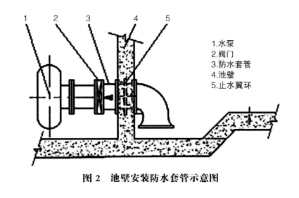 為確保管道與池壁接觸處防水效果以及避免水泵等設(shè)備運行時產(chǎn)生振動使接觸處松動,安裝帶有止水翼環(huán)(如圖1中⑩所示)的防水套管(如圖1中⑥所示)。防水套管的安裝與模板、鋼筋的施工同步進(jìn)行,密切配合,做到高程、位置完全準(zhǔn)確,安裝牢固。套管穿越處池壁中的鋼筋彎曲或截斷時,鋼筋與套管焊接相連,套管四周按設(shè)計要求安裝加同筋。防水套管施工如圖2所示。