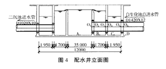 本文以污水處理廠常見的二沉池配水井為例,說明同軸多套管的安裝控制。某圓環(huán)形二沉池配水井為中心層配水、中間層進水、周邊層出水工藝,其立面圖見圖4,其中心配水層進水管一自生化池總進水管D1420x12,連續(xù)穿過3道隔墻,共需預(yù)埋3個防水套管,且套管之間的間距較小,僅為2m左右。如何控制此3個套管的預(yù)埋精度至關(guān)重要。