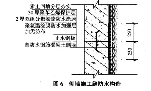 側(cè)墻水平施工縫兩邊250 mm范圍內(nèi)增設(shè)防水層一道。具體處理,見圖6。