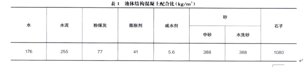 后坍落度13.2cm、14d水中限制制膨脹率0.026%、28d抗壓強(qiáng)度35.4MPa、、水質(zhì)凈化池池體結(jié)構(gòu)混凝土配合比見表1.