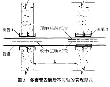 預(yù)埋套管安裝位置不準確對同軸多套管的影響最為明顯:當一根直管道連續(xù)穿過2個以上的套管時,要求管道沿線預(yù)埋套管的安裝必須嚴格同軸,否則混凝土成型后,管道無法安裝,當套管之間的距離L較小時,此問題尤為嚴重。同軸多套管安裝后不同軸的示意圖見圖3。