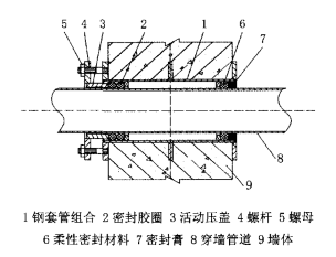 過(guò)鋼套管,然后把活動(dòng)壓蓋插入鋼套管組合,擰上螺桿,擰緊螺母,使項(xiàng)壓套管壓緊橡膠密封圈,橡膠密封圈經(jīng)受壓迫產(chǎn)生交形,與鋼套管內(nèi)壁及穿墻管道外壁